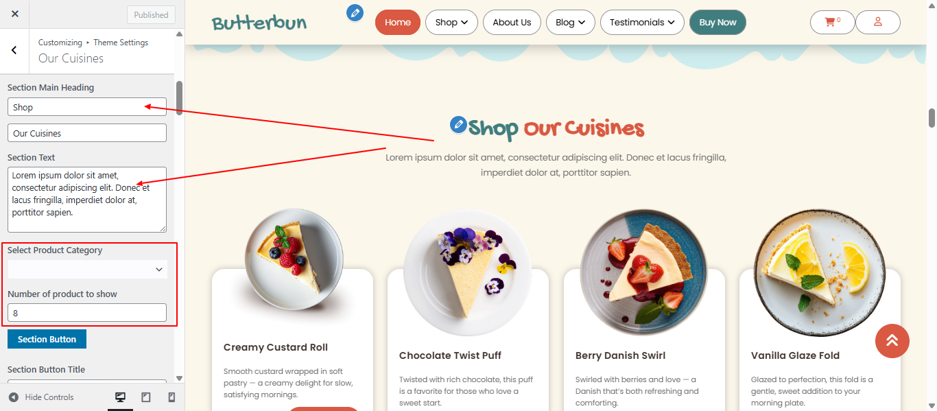 Open "Our Cuisines" from the Theme Settings panel in the Customizer.