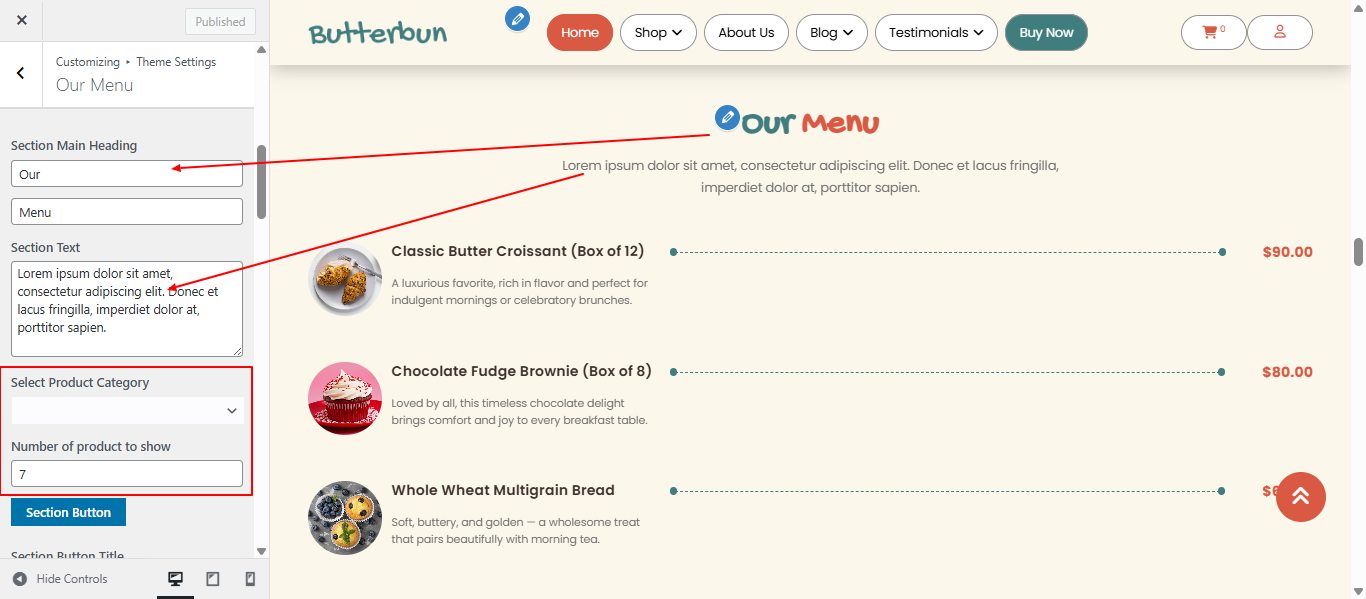 Open "Our Menus" from the Theme Settings panel in the Customizer.