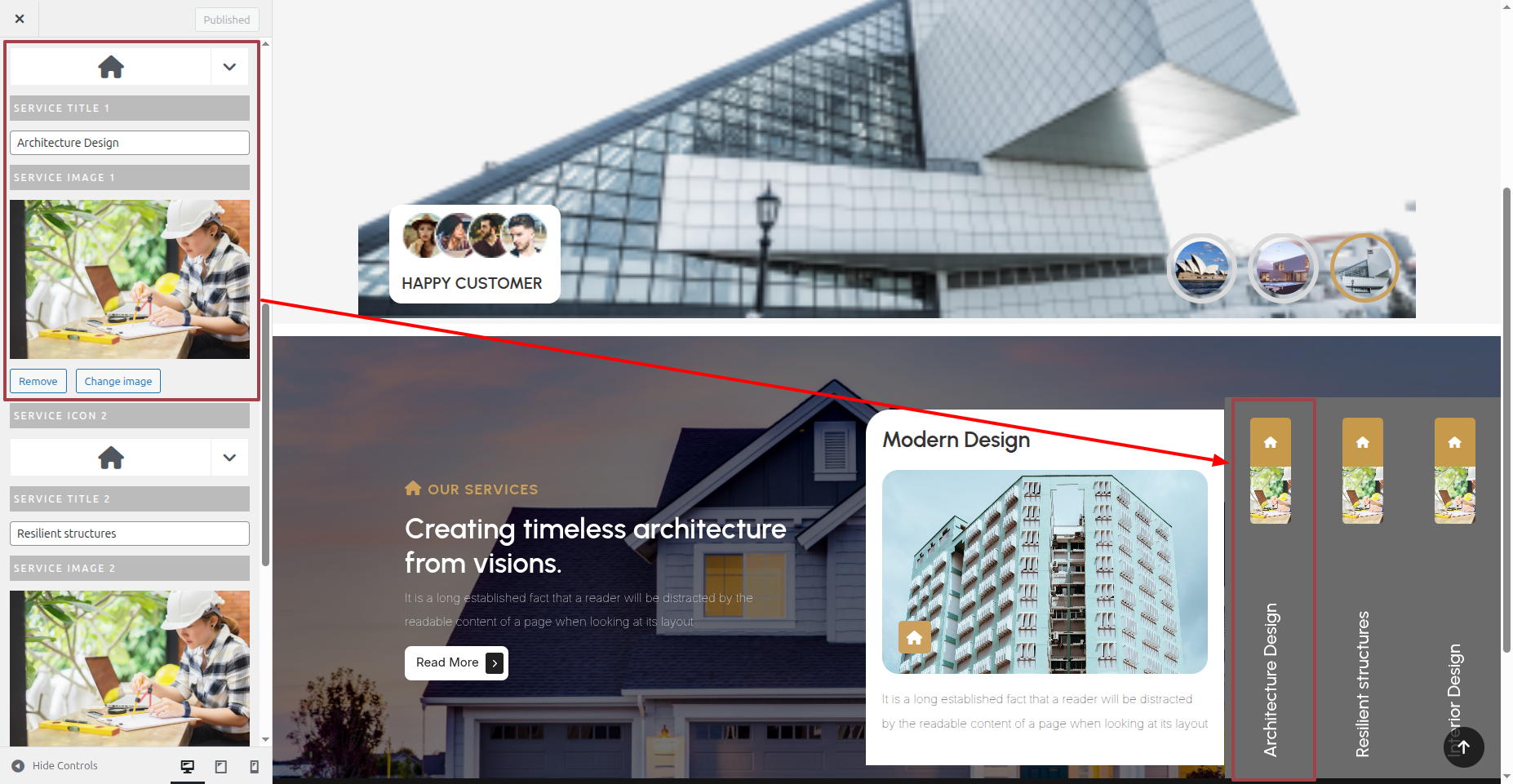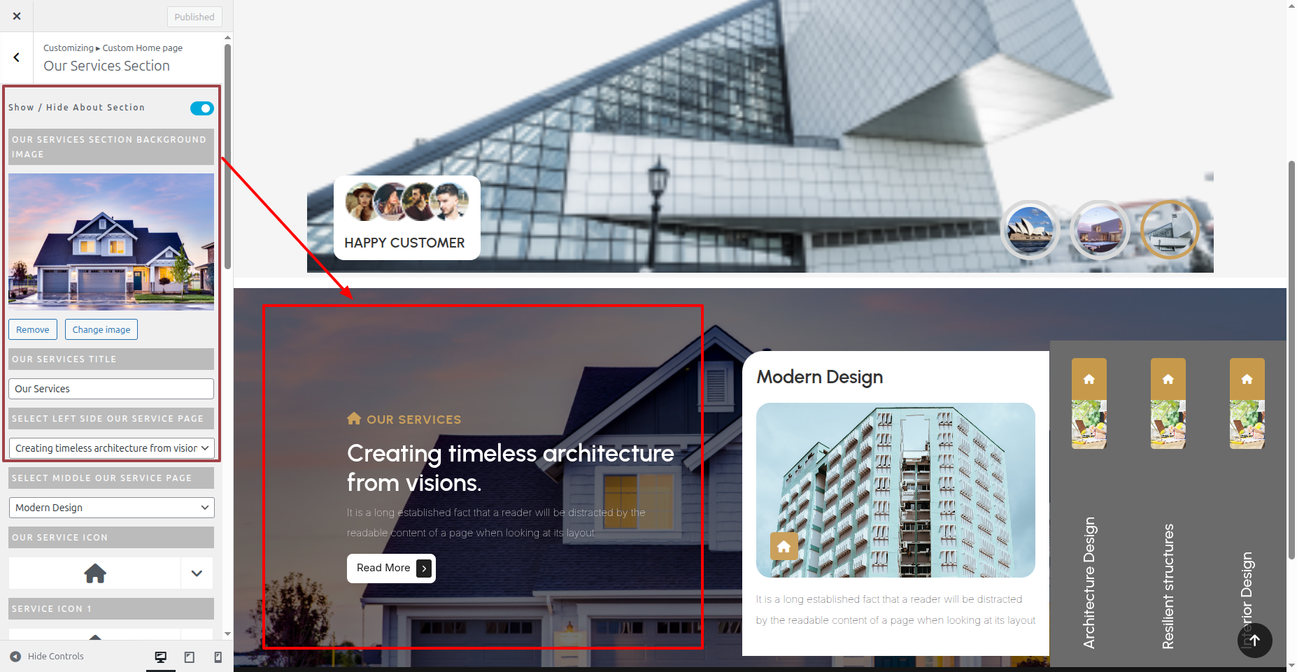 Click Appearance >> Customize >> Custom Home Page >> Our Services Section