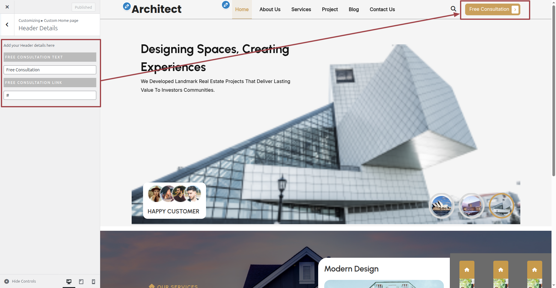 Click Appearance >> Customize >> Custom Home Page >> Header Details