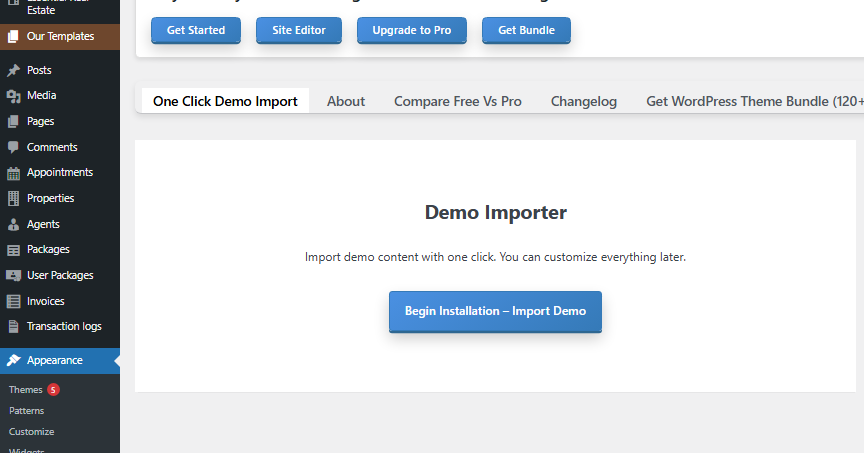 Go to the Dashboard >> Appearance >> Begin Installation – Import Demo >> Click on One Click Demo Import Tab >> Than click on Begin Installation – Import Demo Button