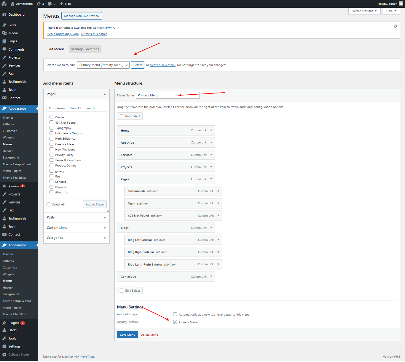 Manage the header menu from Appearance → Menus in the dashboard.