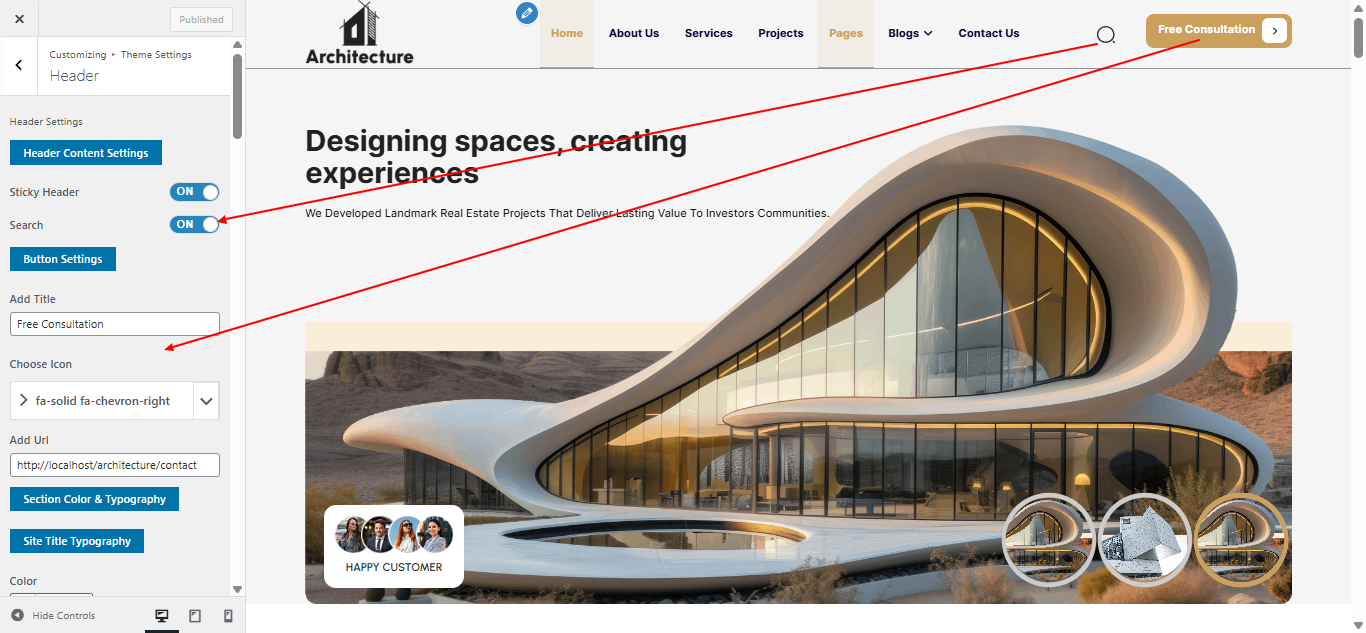 Now go to Appearance → Customize → Theme Settings → Header to update header content.