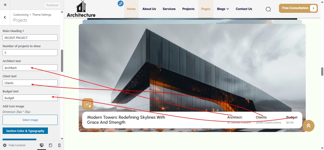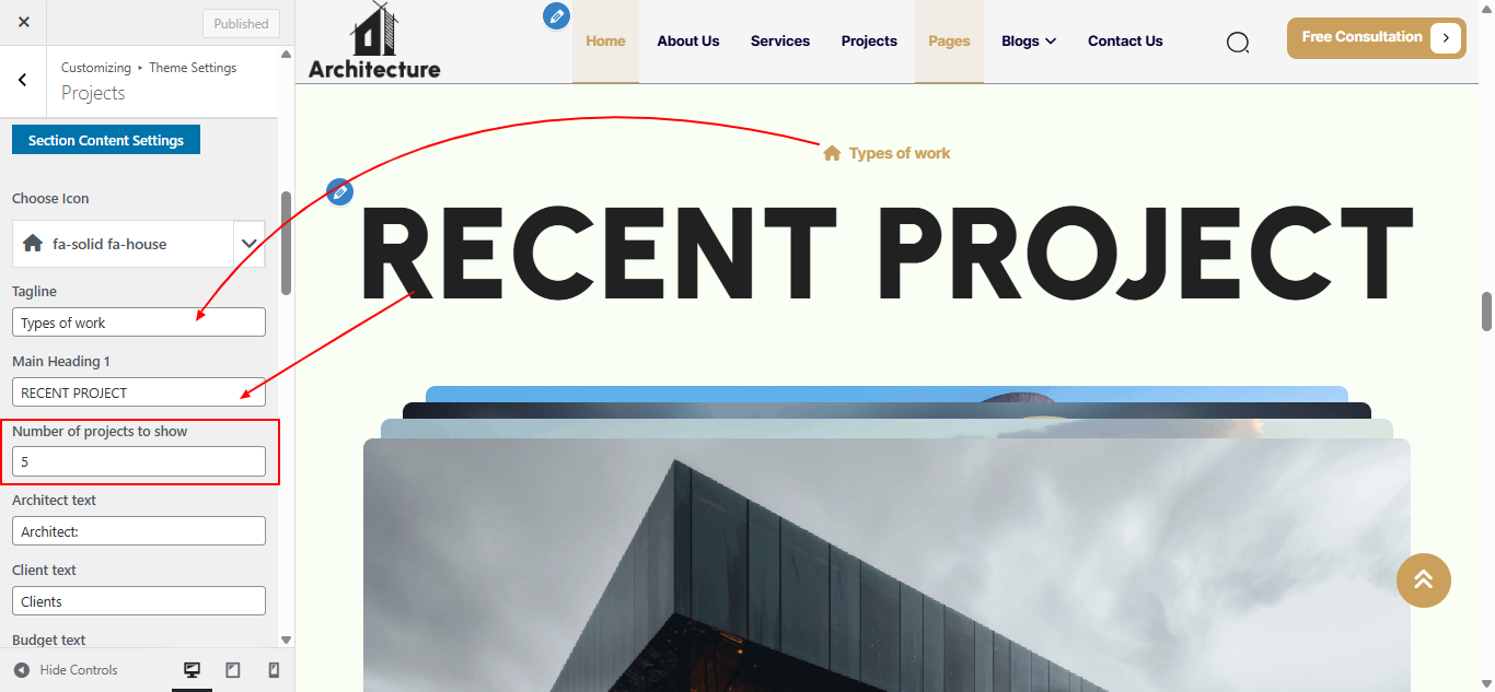 Open "Projects" from the Theme Settings panel in the Customizer.