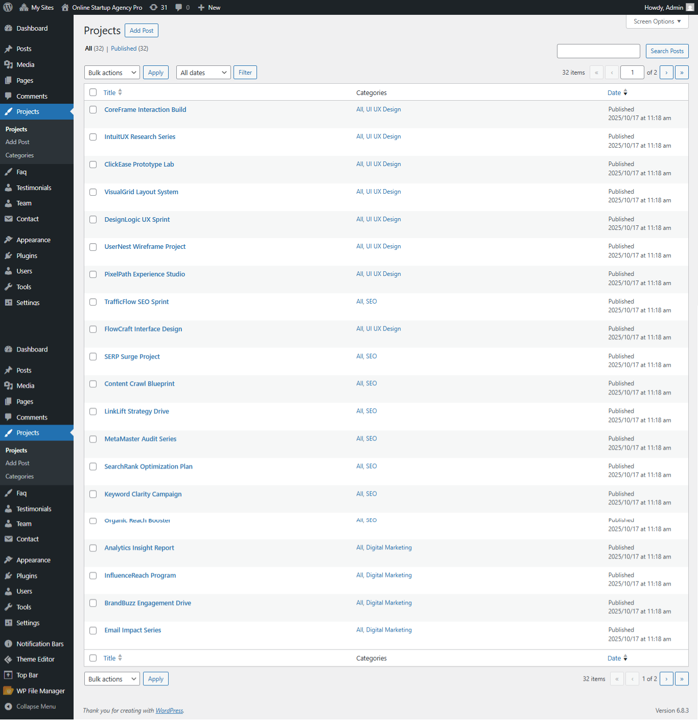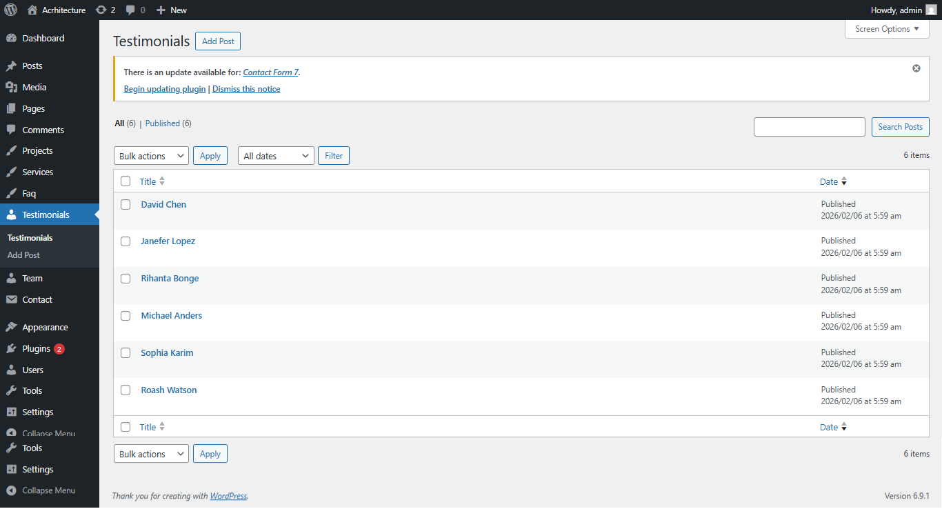Go to Dashboard → Testimonials to view demo testimonials.