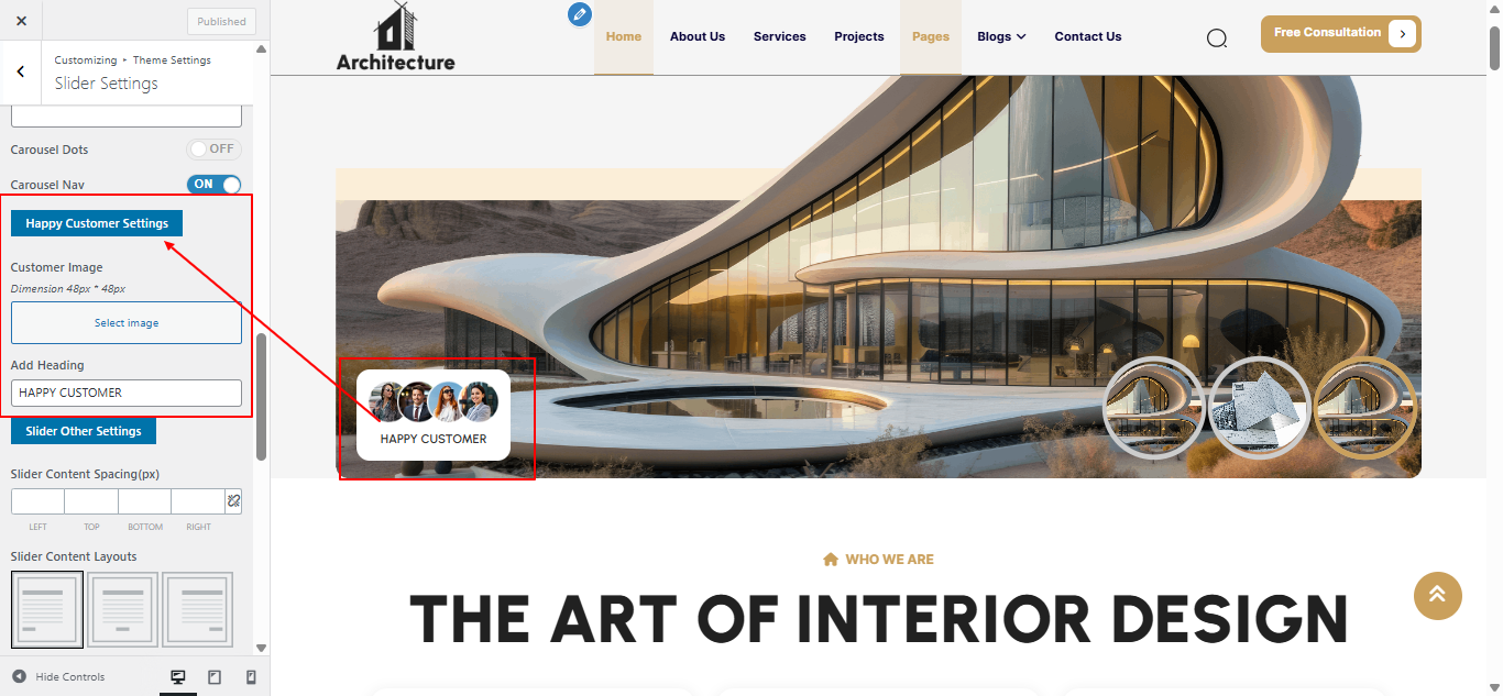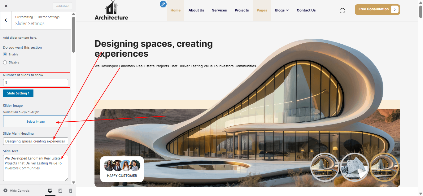 Open "Slider" from the Theme Settings panel in the Customizer.