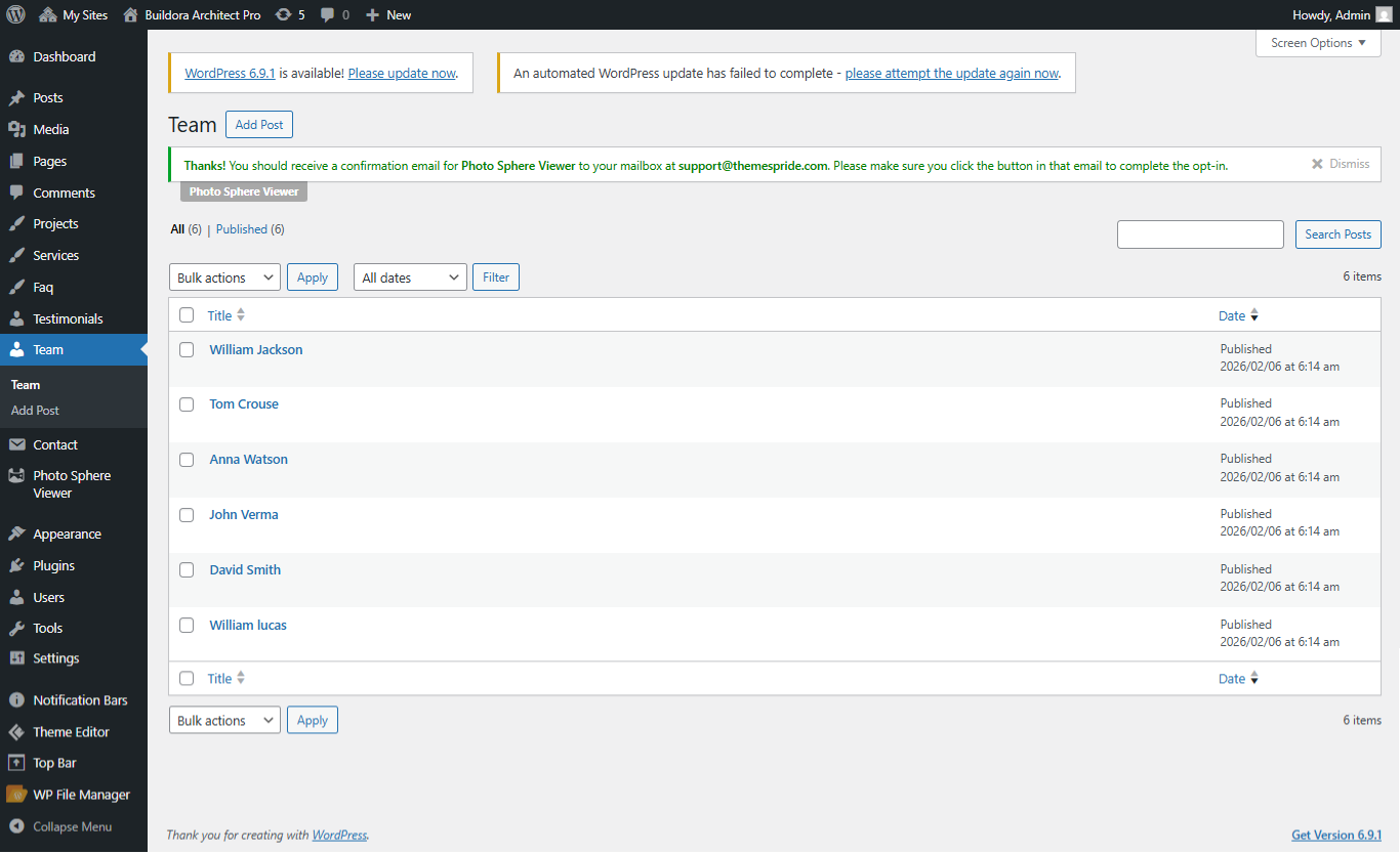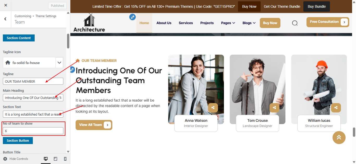 Open "Team" from the Theme Settings panel in the Customizer.