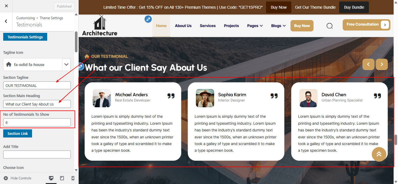 Open "Testimonials" from the Theme Settings panel in the Customizer.