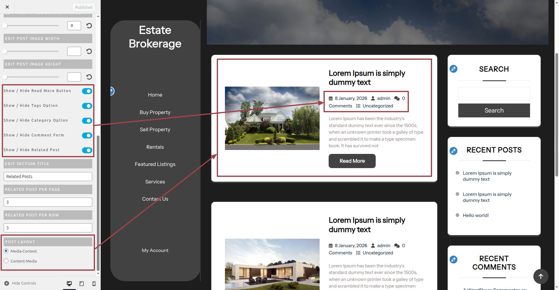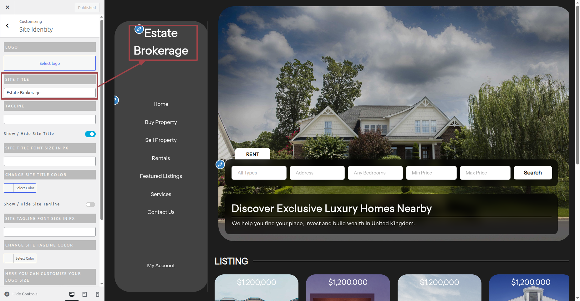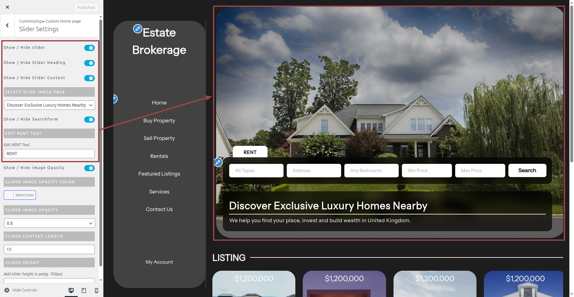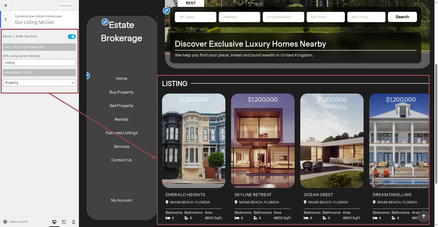 Click Appearance >> Customize >> Custom Home Page >> Our Listing