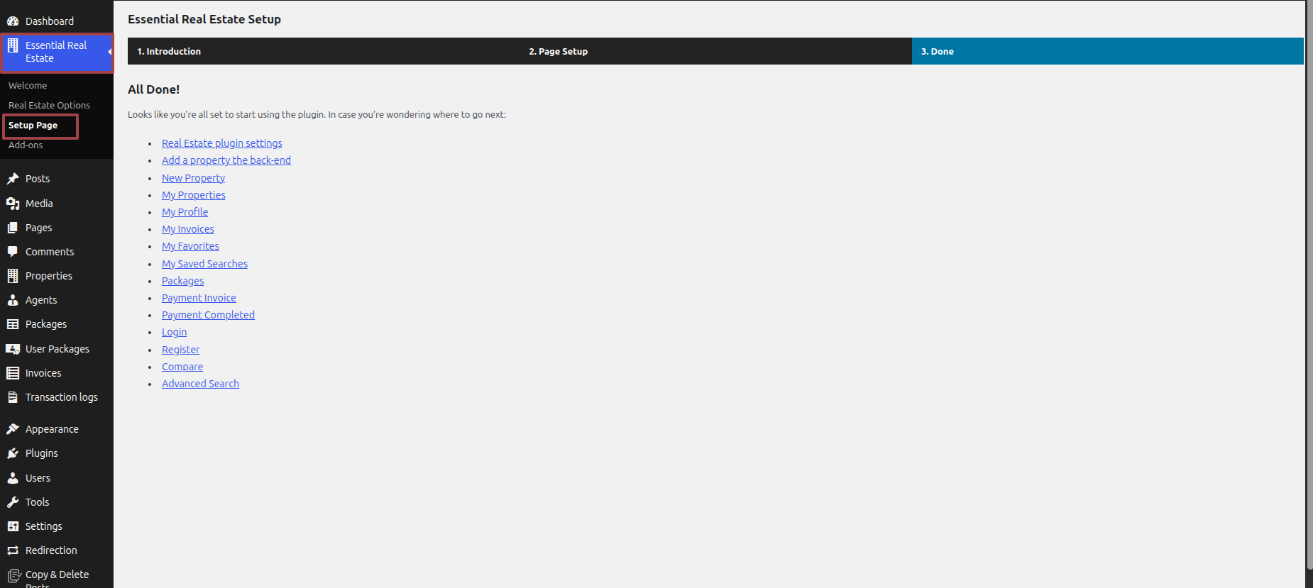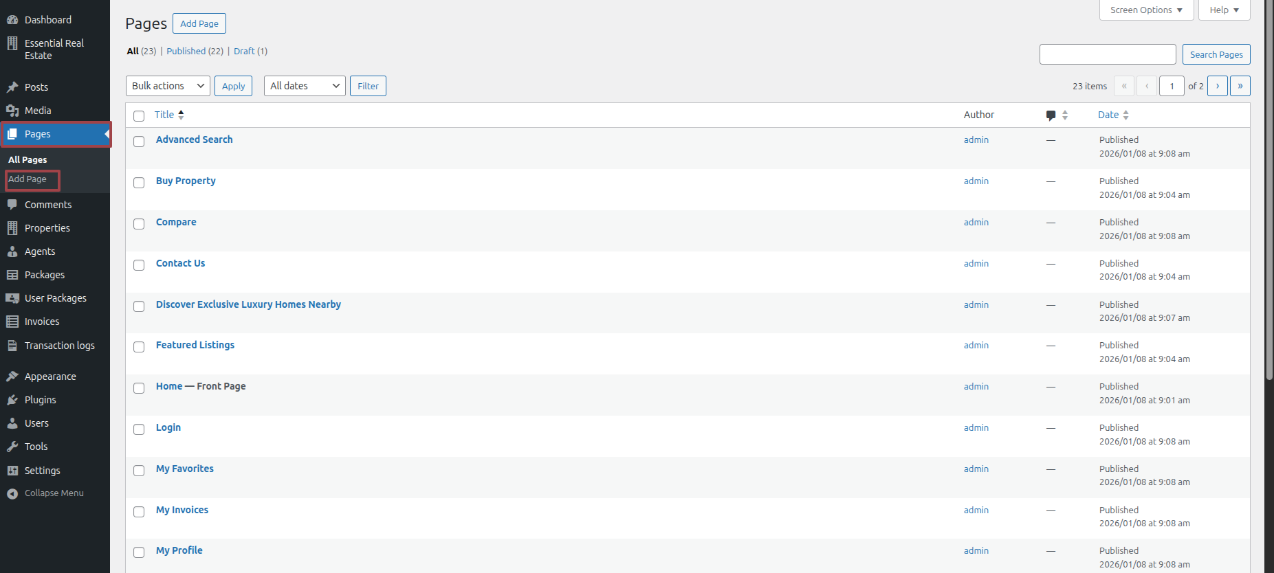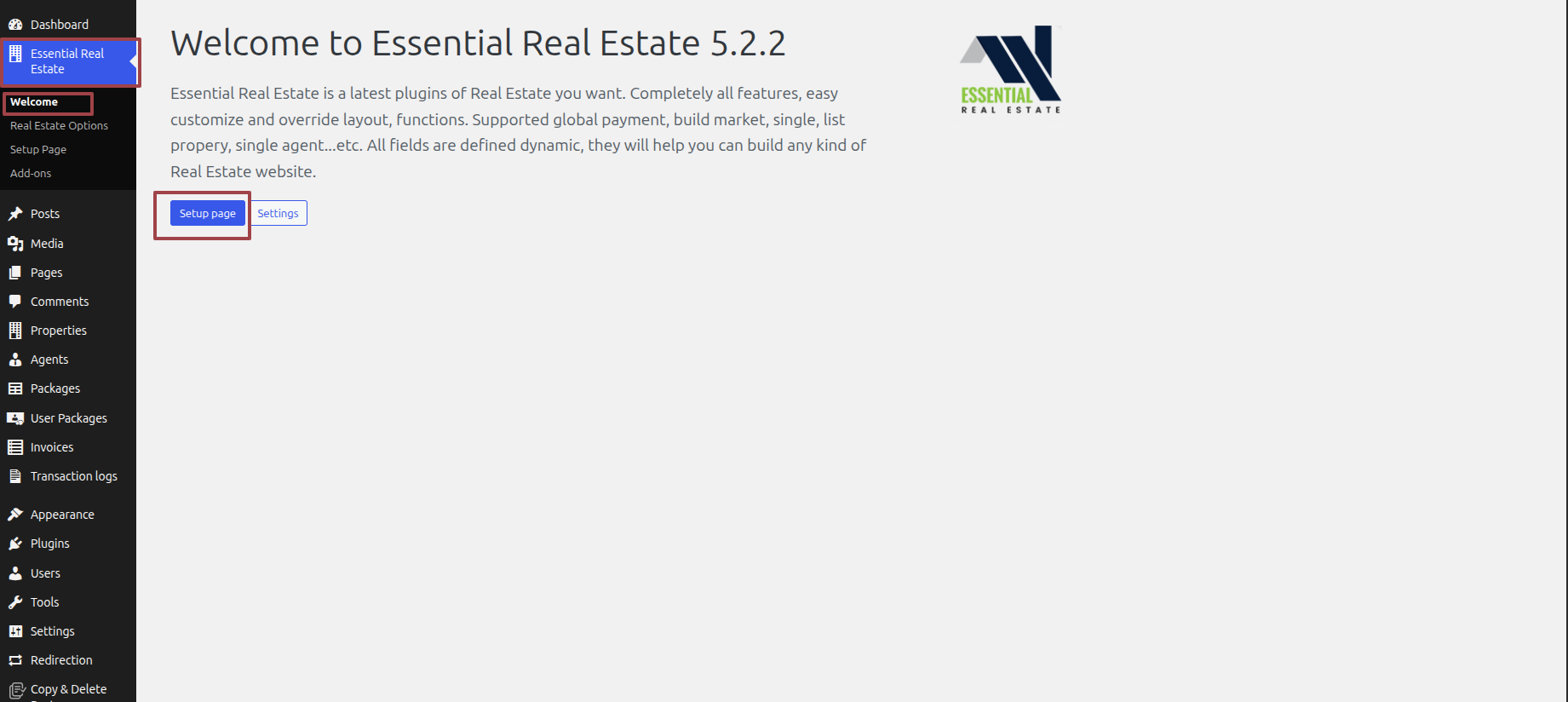 If you receive the notification, please click the Install Setup Pages button. This action will generate all the necessary pages for your Essential Real Estate. Once installed, these pages will be available in the search results, so you will need to complete the installation to ensure they appear in searches. Start by accessing the appropriate section to configure the Properties. Alternatively, if you create the pages yourself, when you perform a search you will be presented with date selection options, and the relevant functions will be available to you. Click Dashboard >> Properties >> Add New Properties