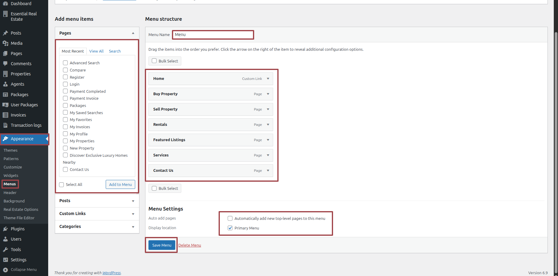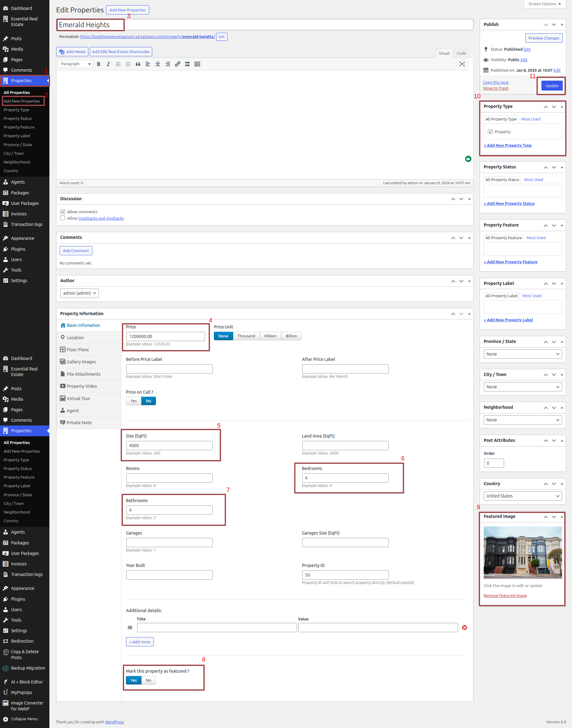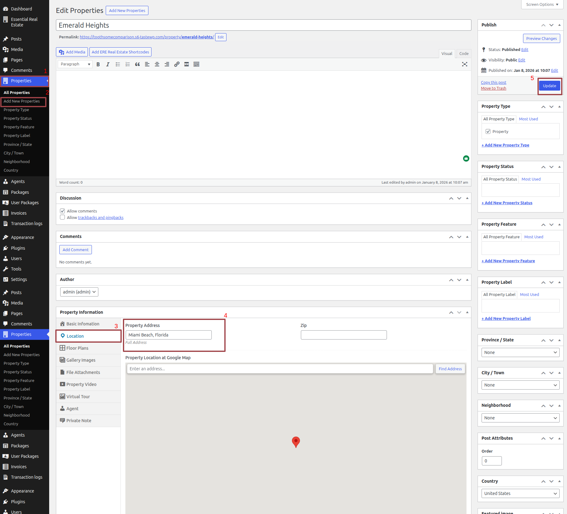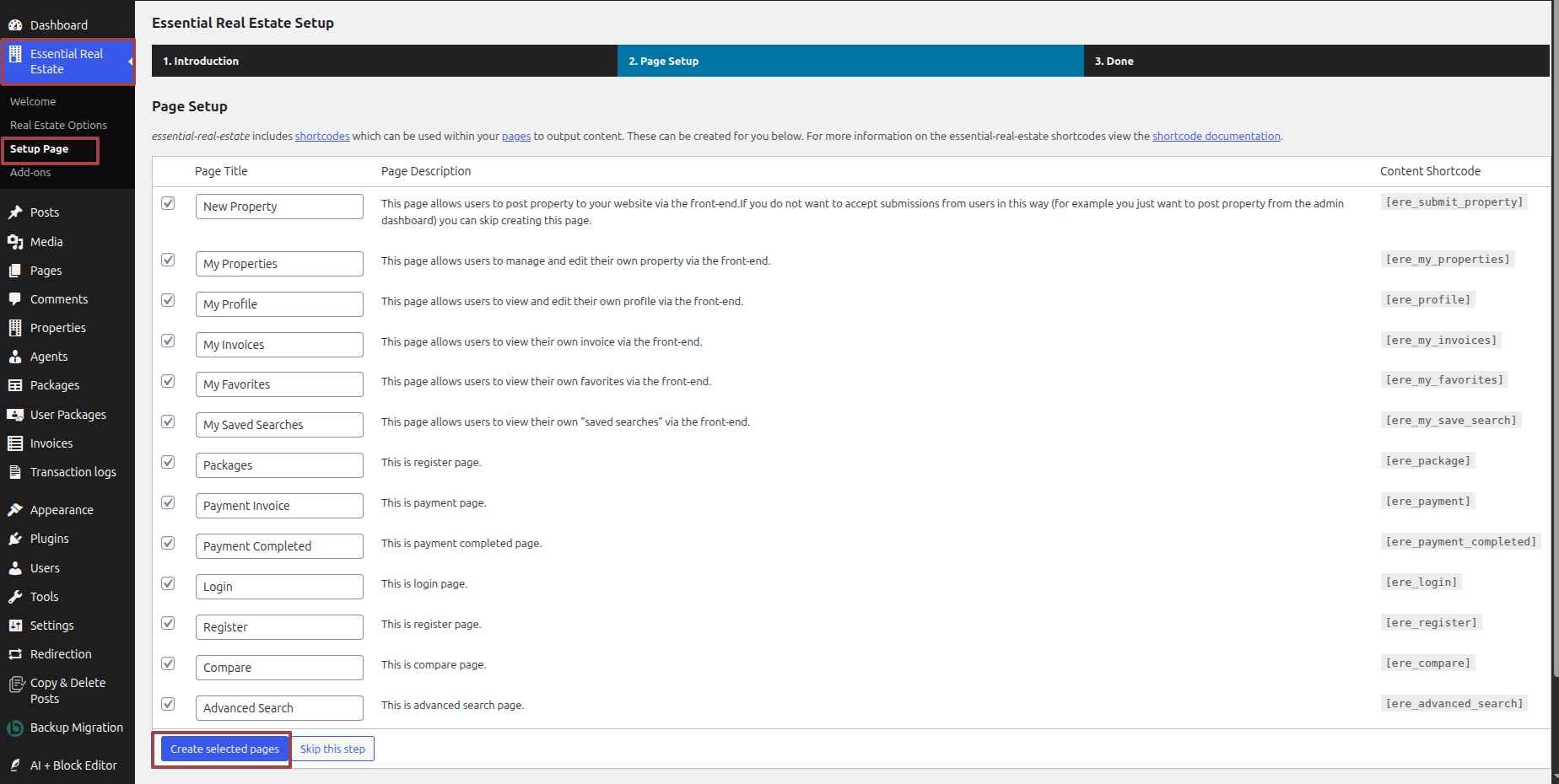 If you receive the notification, please click the Install Setup Pages button. This action will generate all the necessary pages for your Essential Real Estate. Once installed, these pages will be available in the search results, so you will need to complete the installation to ensure they appear in searches. Start by accessing the appropriate section to configure the Properties. Alternatively, if you create the pages yourself, when you perform a search you will be presented with date selection options, and the relevant functions will be available to you. Click Dashboard >> Properties >> Add New Properties