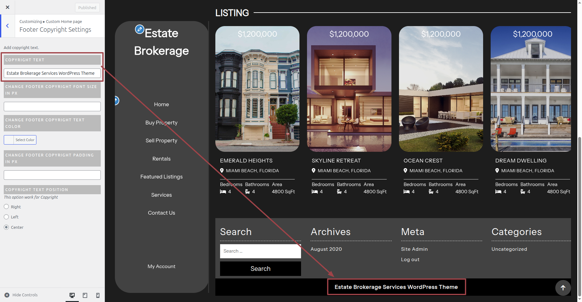 From Menu Click Appearance than Customize >> Custom Home Page >> Footer Copyright Settings