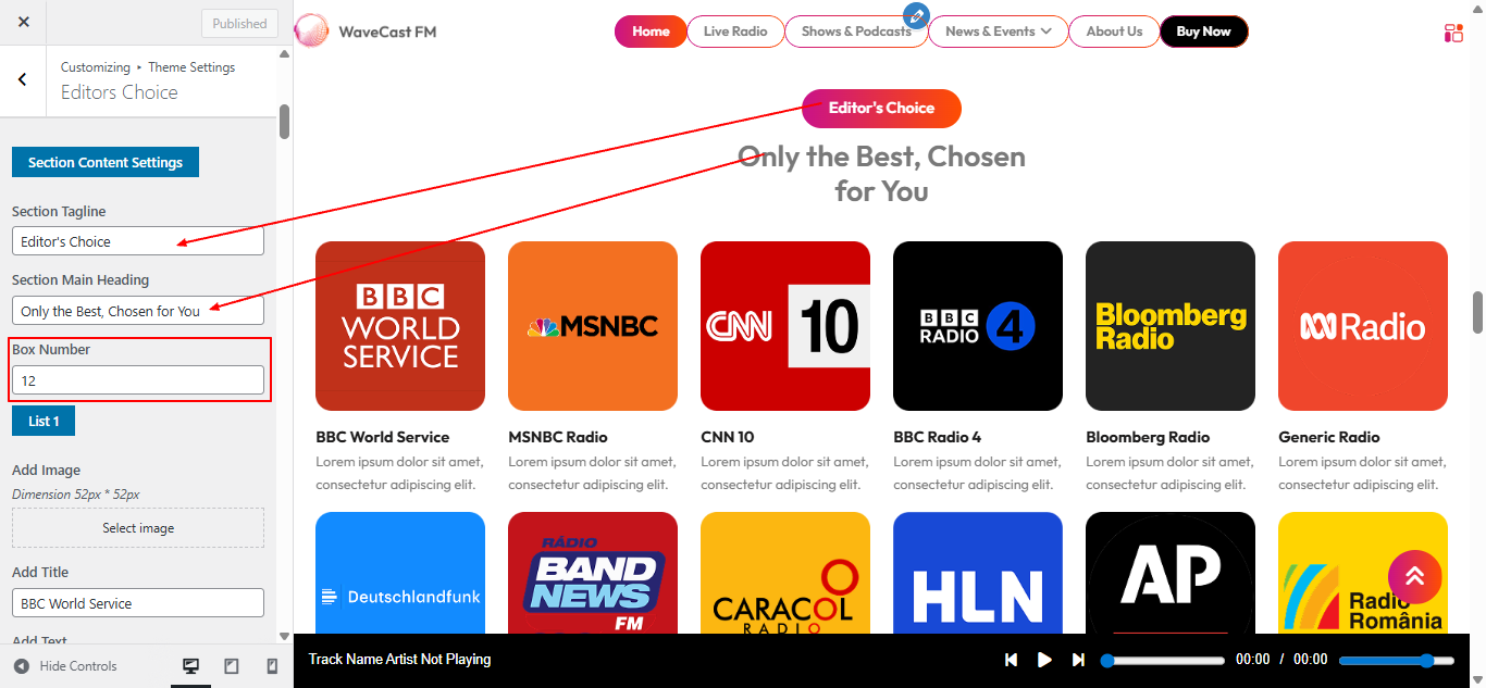 Open "Editors Choice" from the Theme Settings panel in the Customizer.