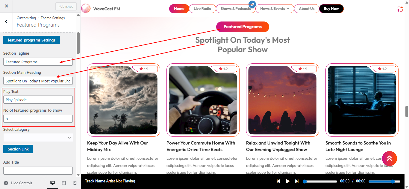 Open "Featured Programs" from the Theme Settings panel in the Customizer.