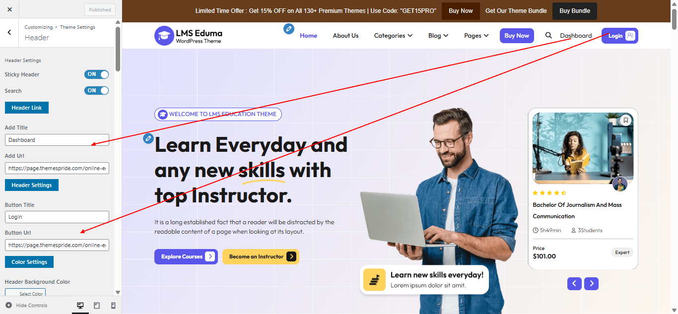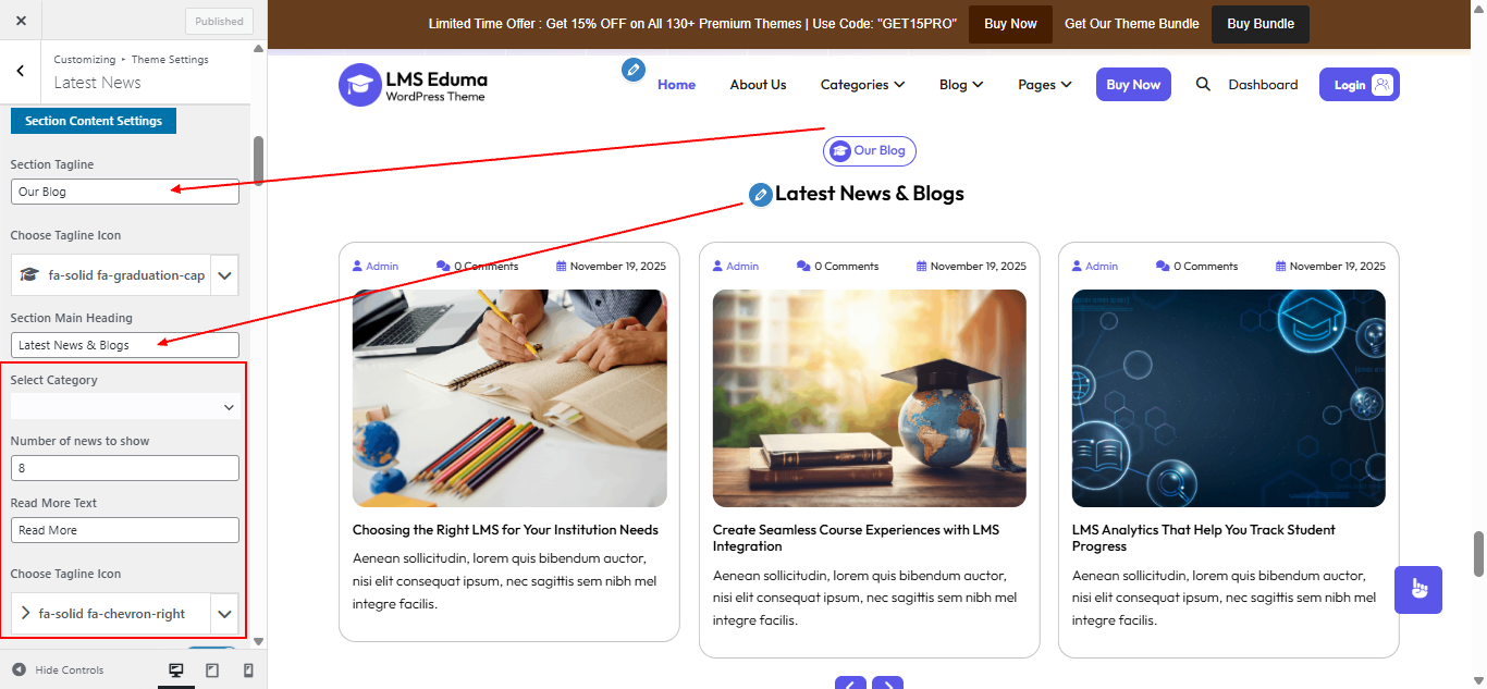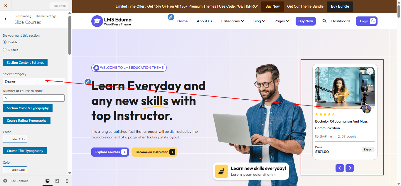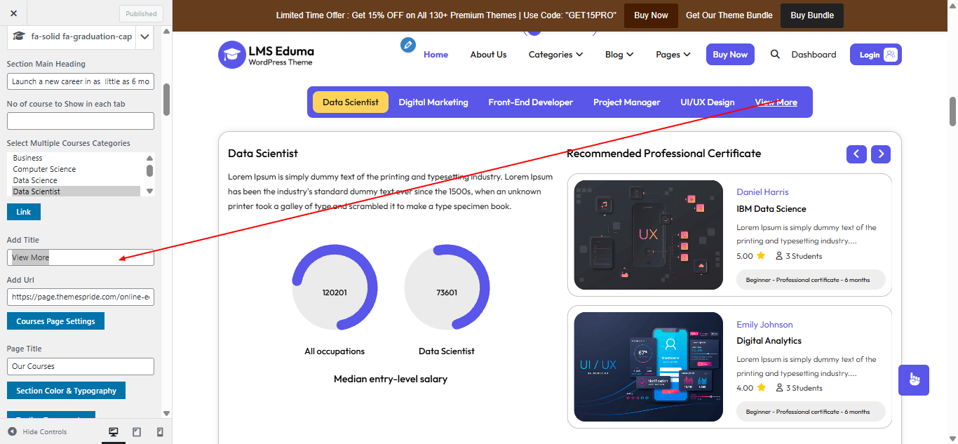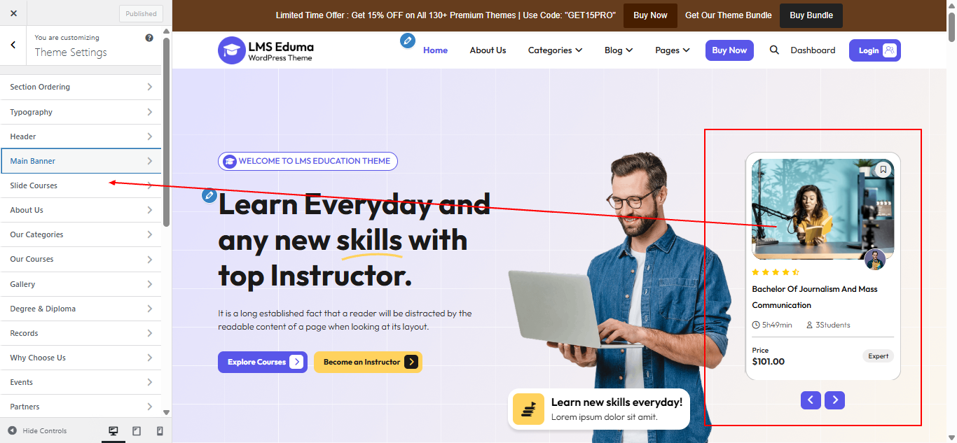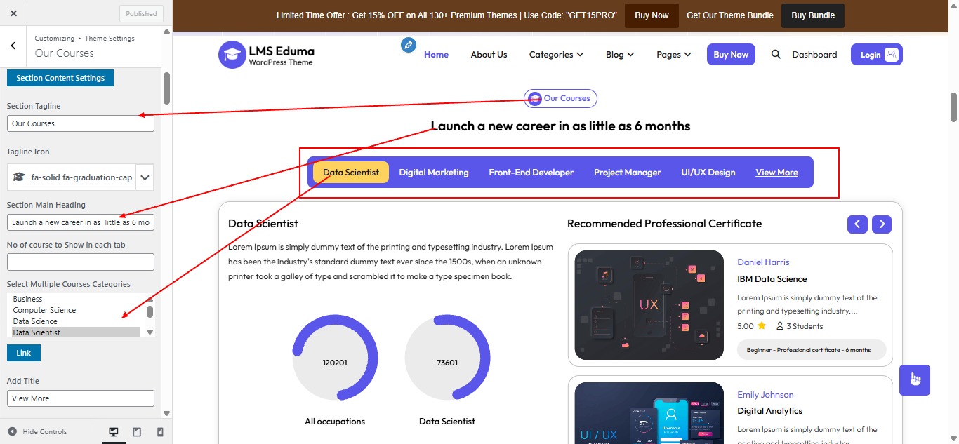 Open "Our Courses" from the Theme Settings panel in the Customizer.