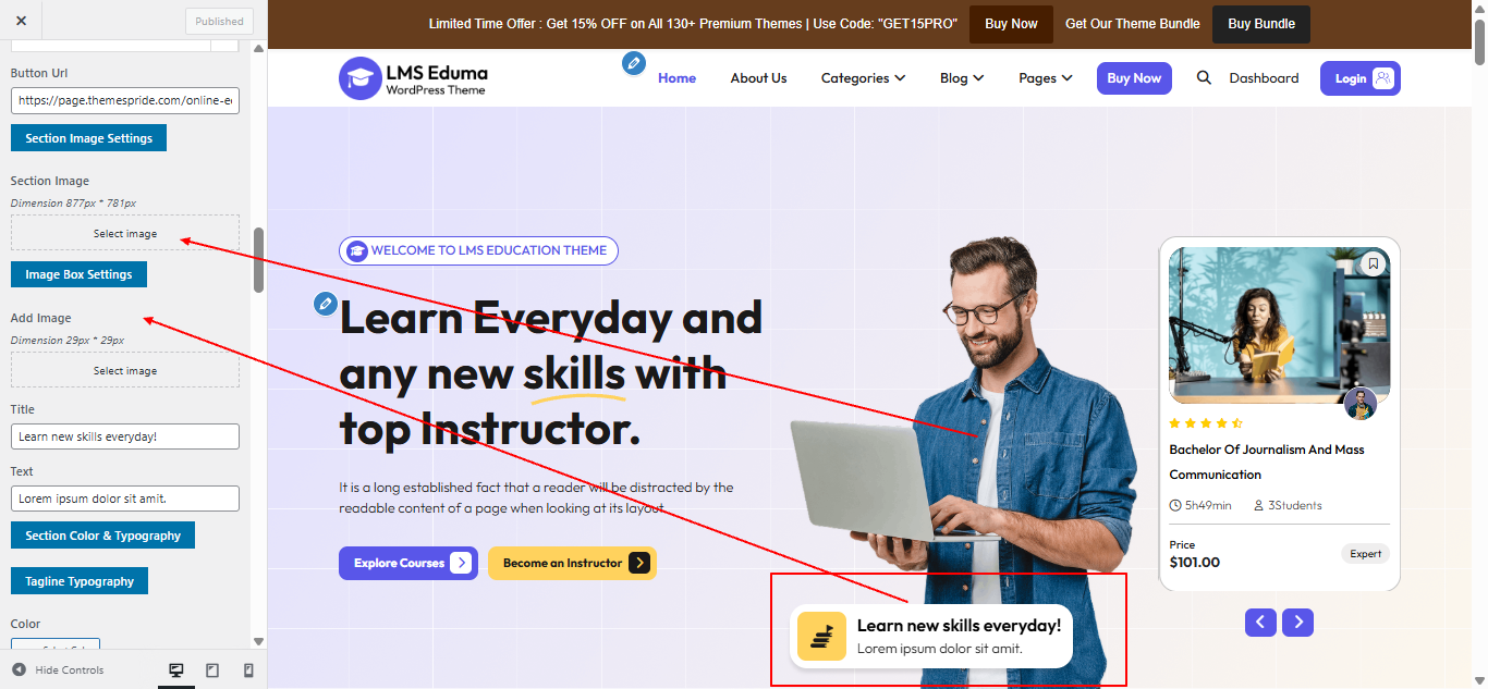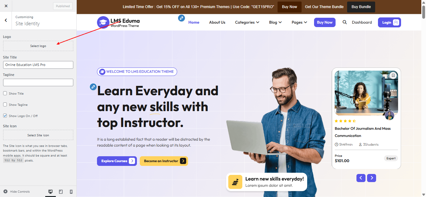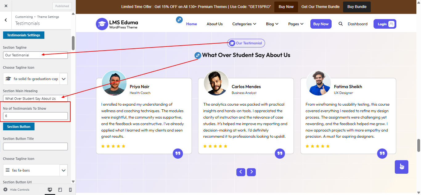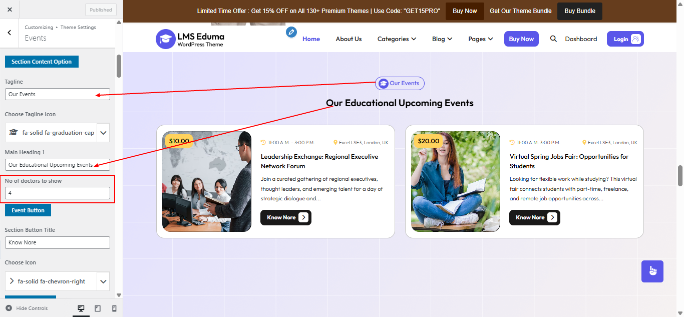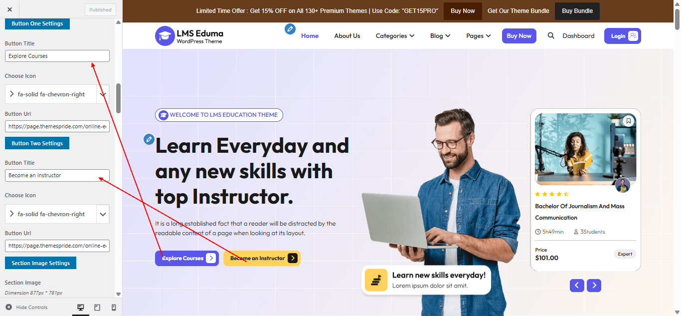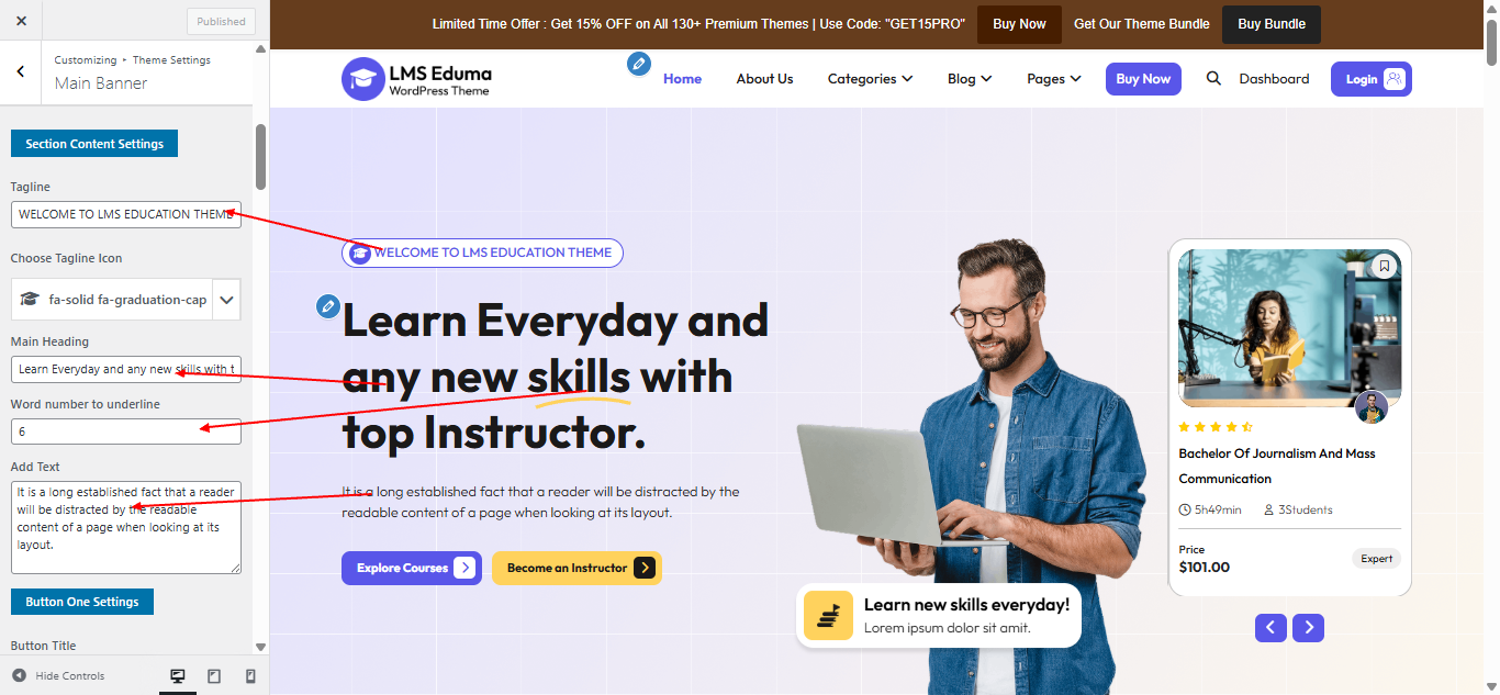 Open "Our Courses" from the Theme Settings panel in the Customizer.