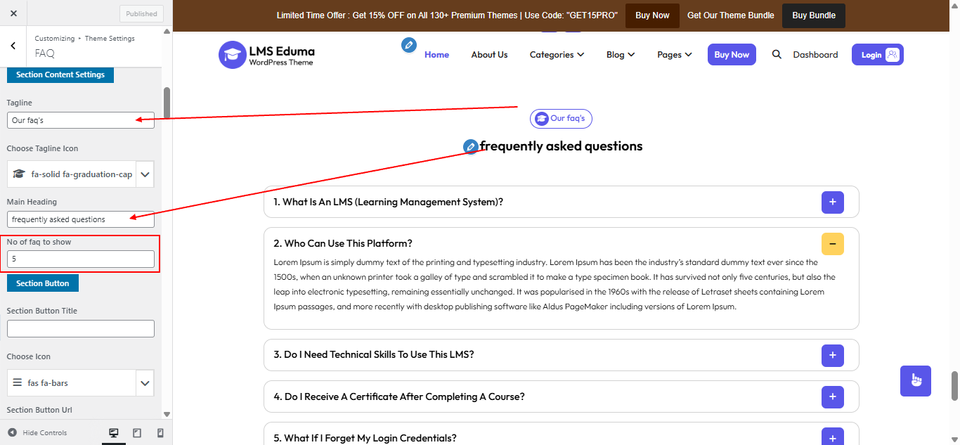 Open "FAQ" from the Theme Settings panel in the Customizer.