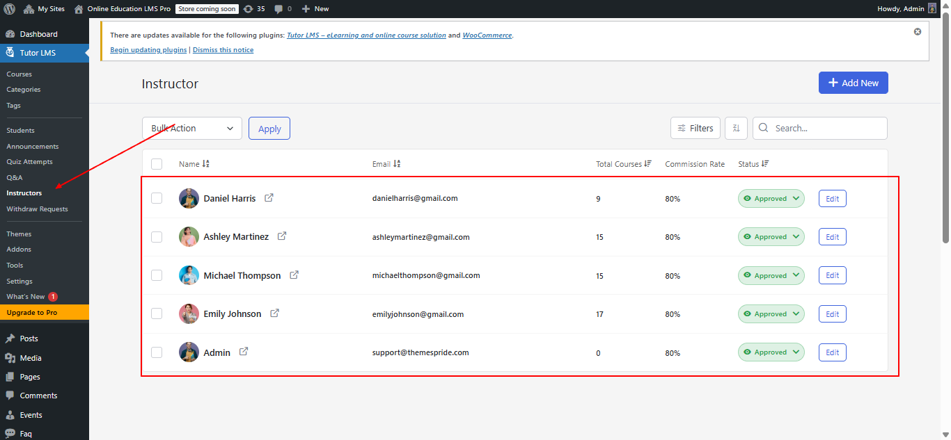 Go to Dashboard → Tutor LMS → instructors to view demo instructors.