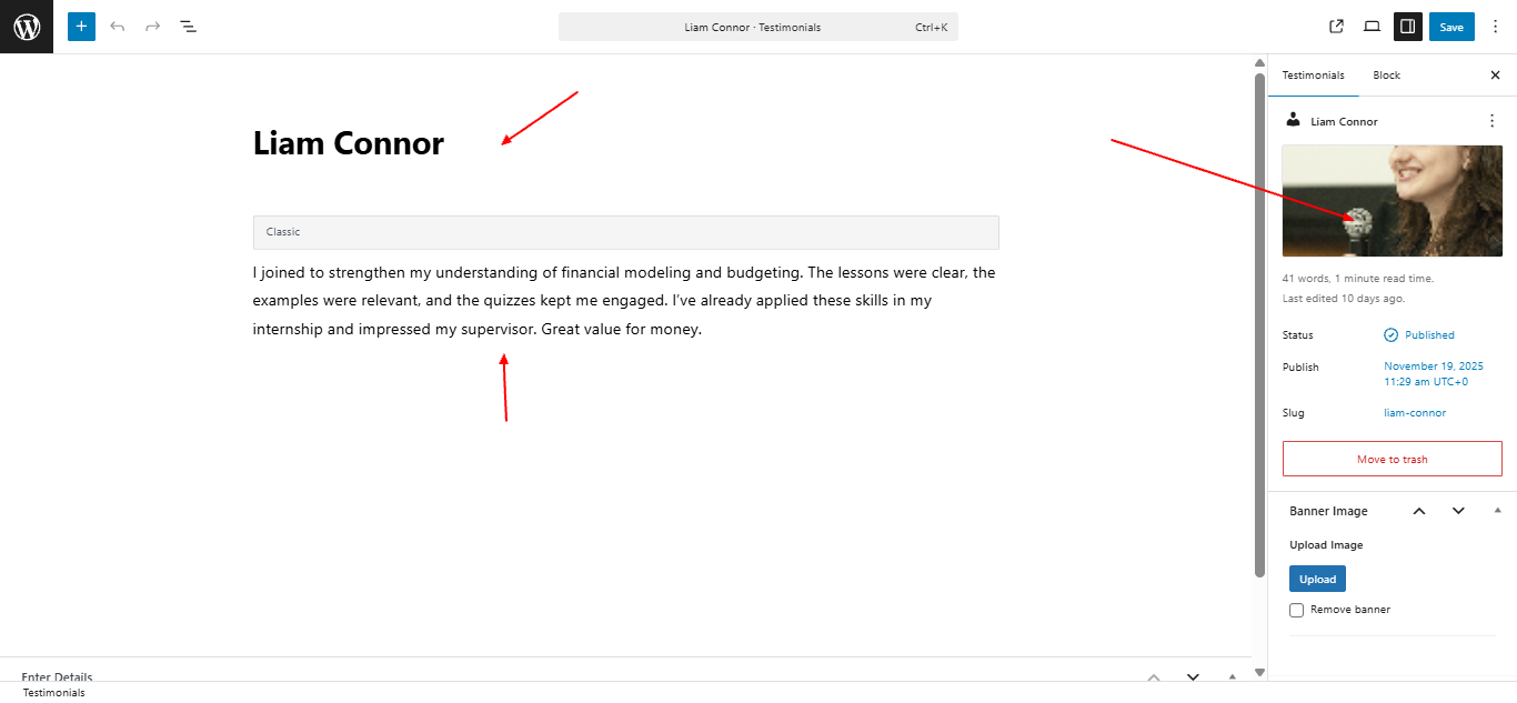 Open "Testimonials" from the Theme Settings panel in the Customizer.