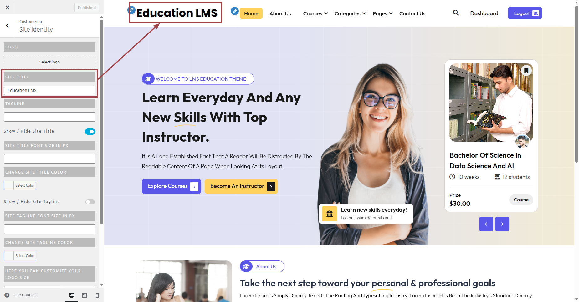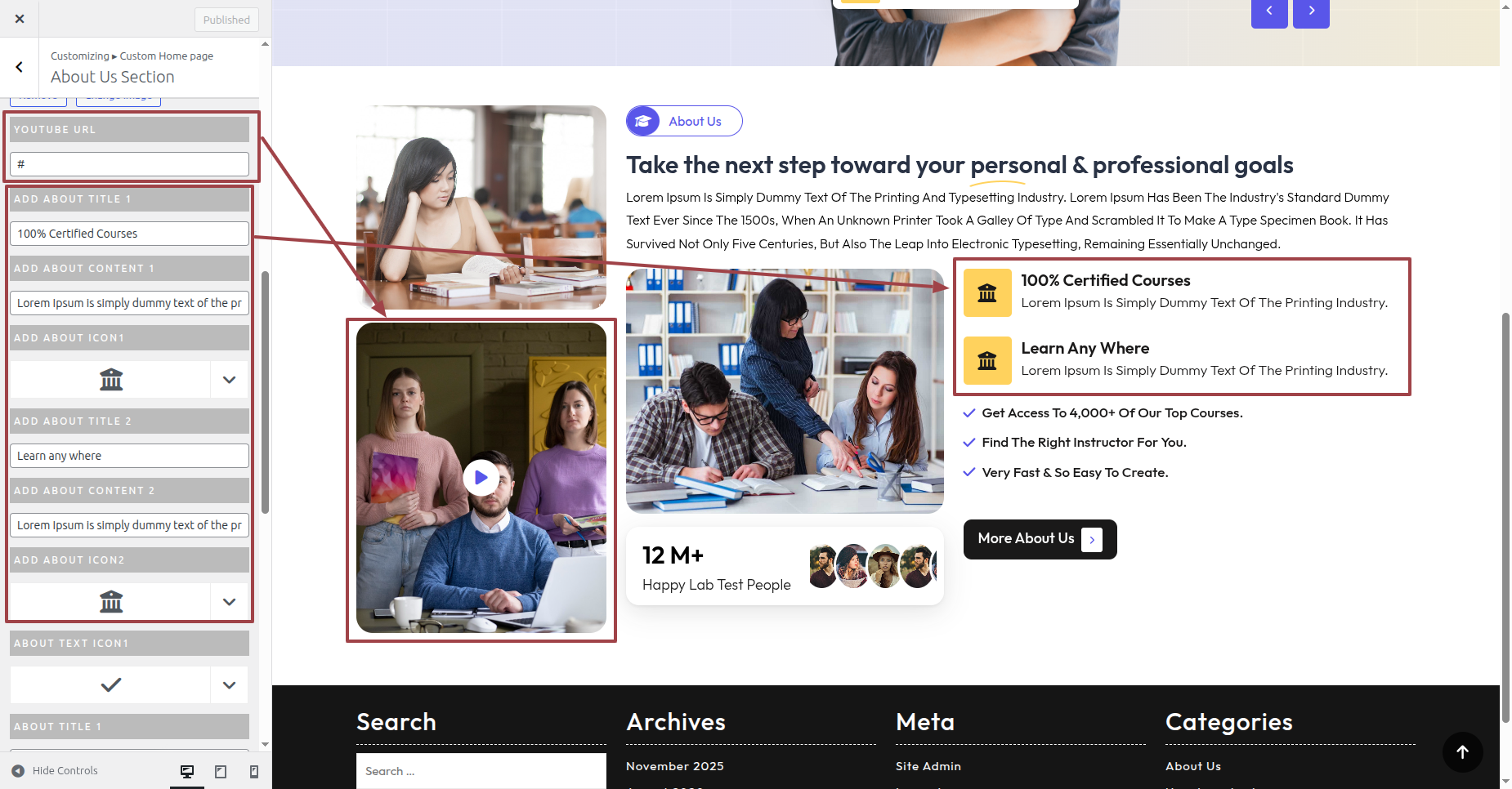 Click Appearance >> Customize >> Custom Home Page >> About Us Section