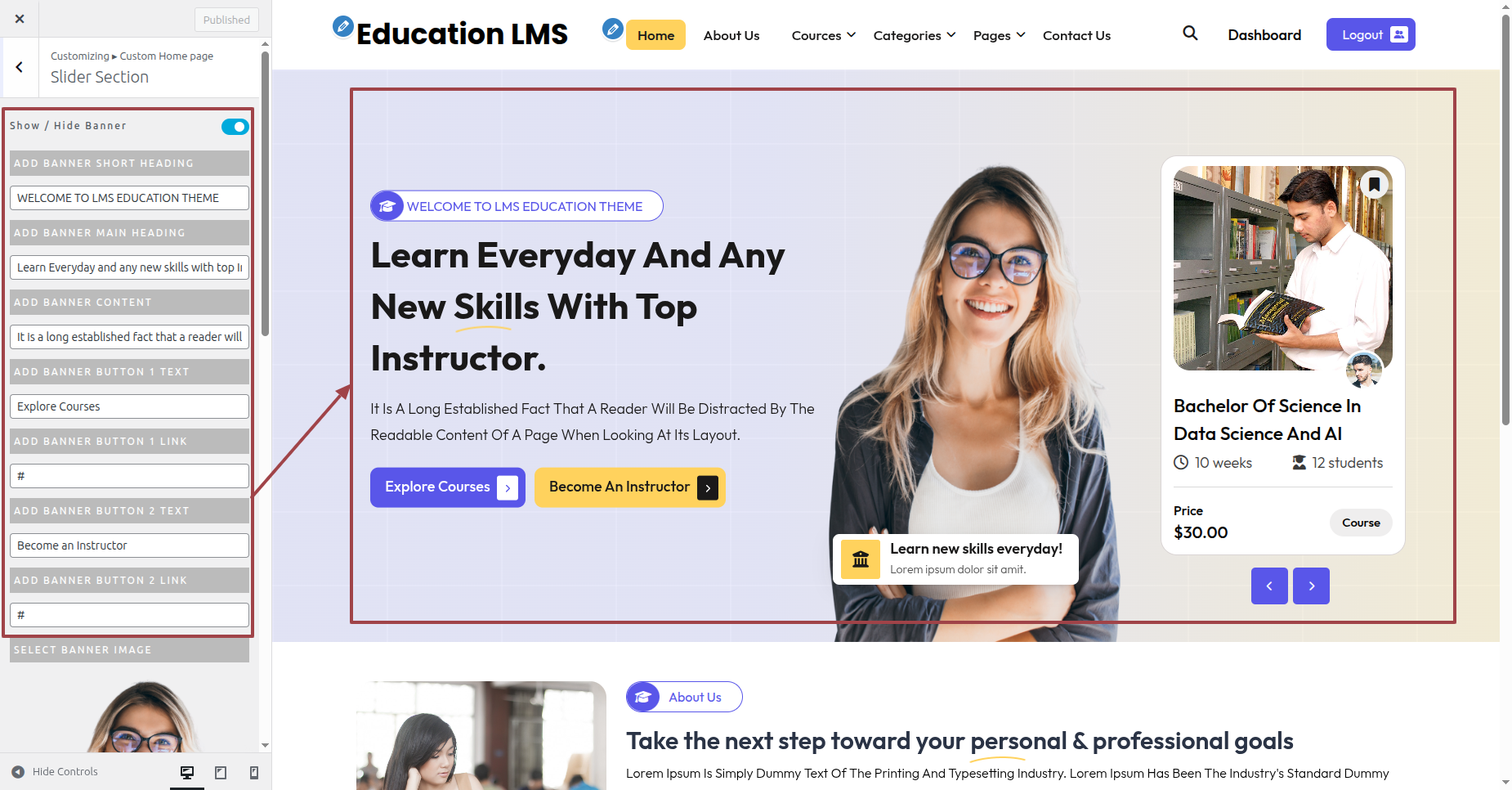 Click Appearance >> Customize >> Custom Home Page >> Slider Section