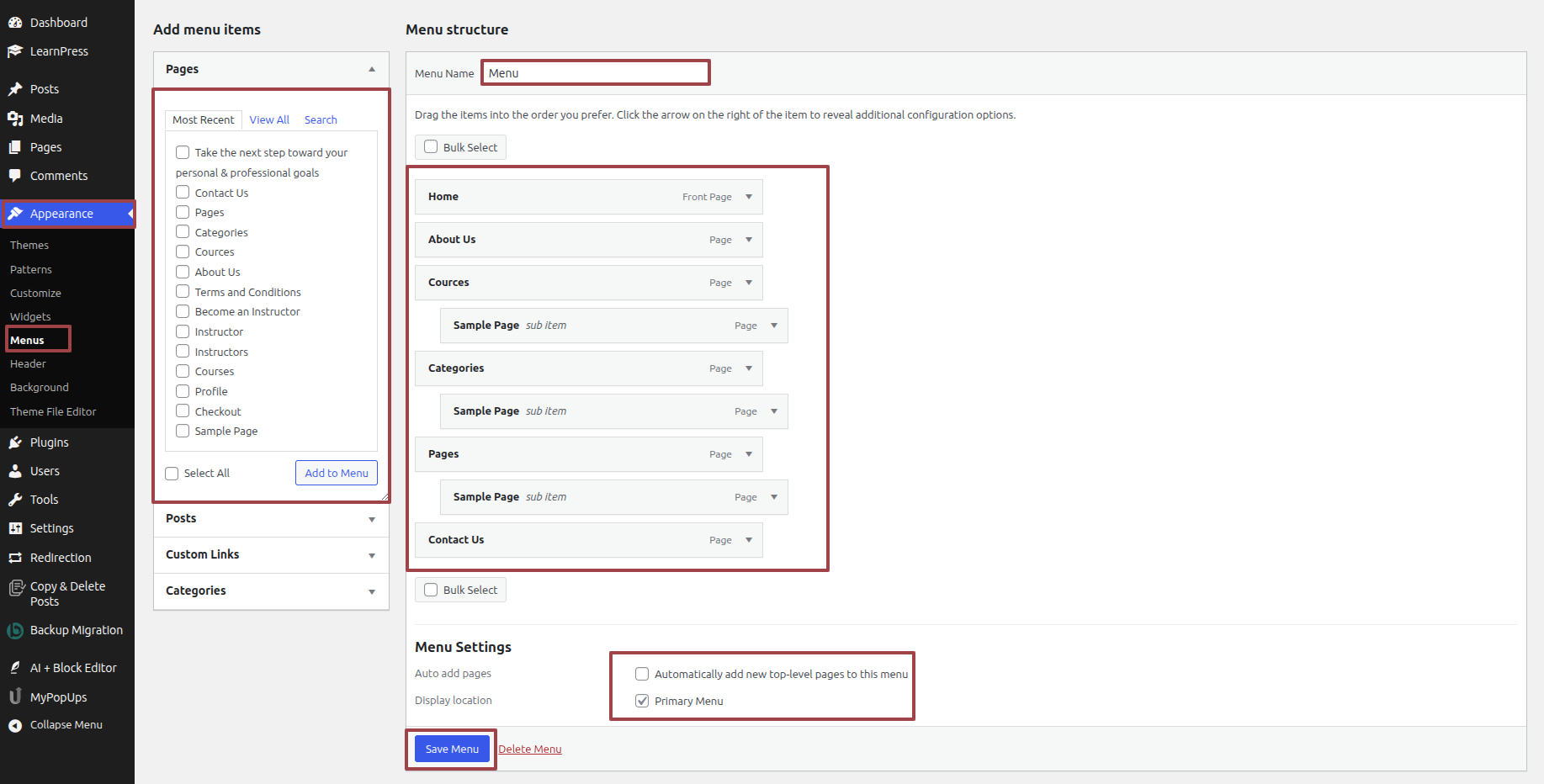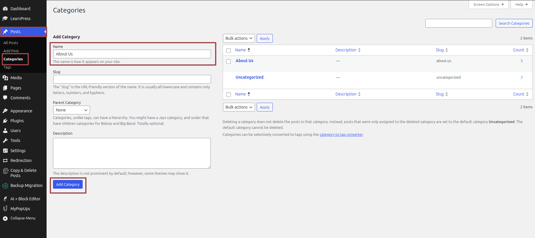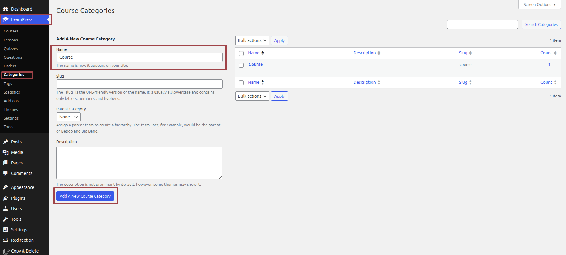 Click Dashboard >> LearnPress >> Categories >> Add A New Course Category