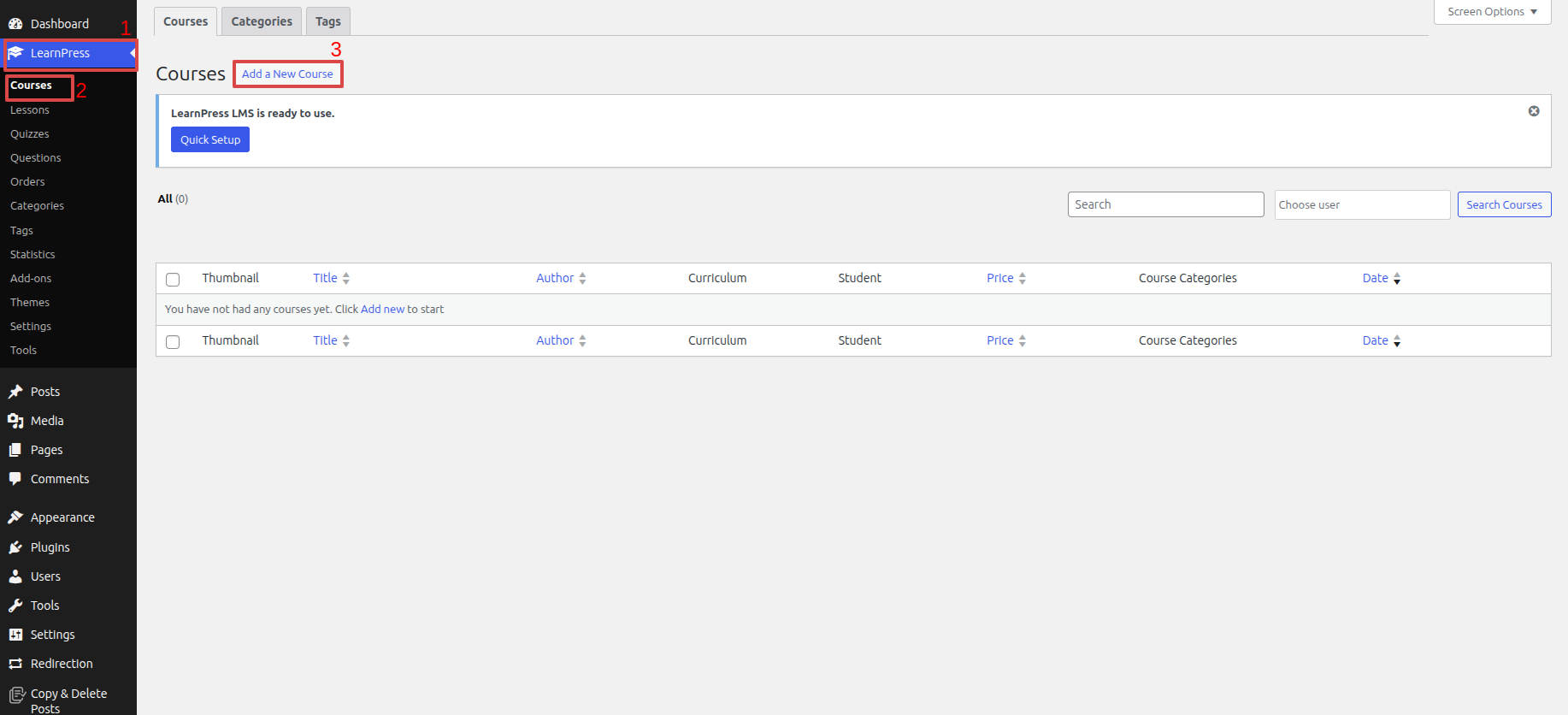 Click Dashboard >> LearnPress >> Courses >> Add a New Courses