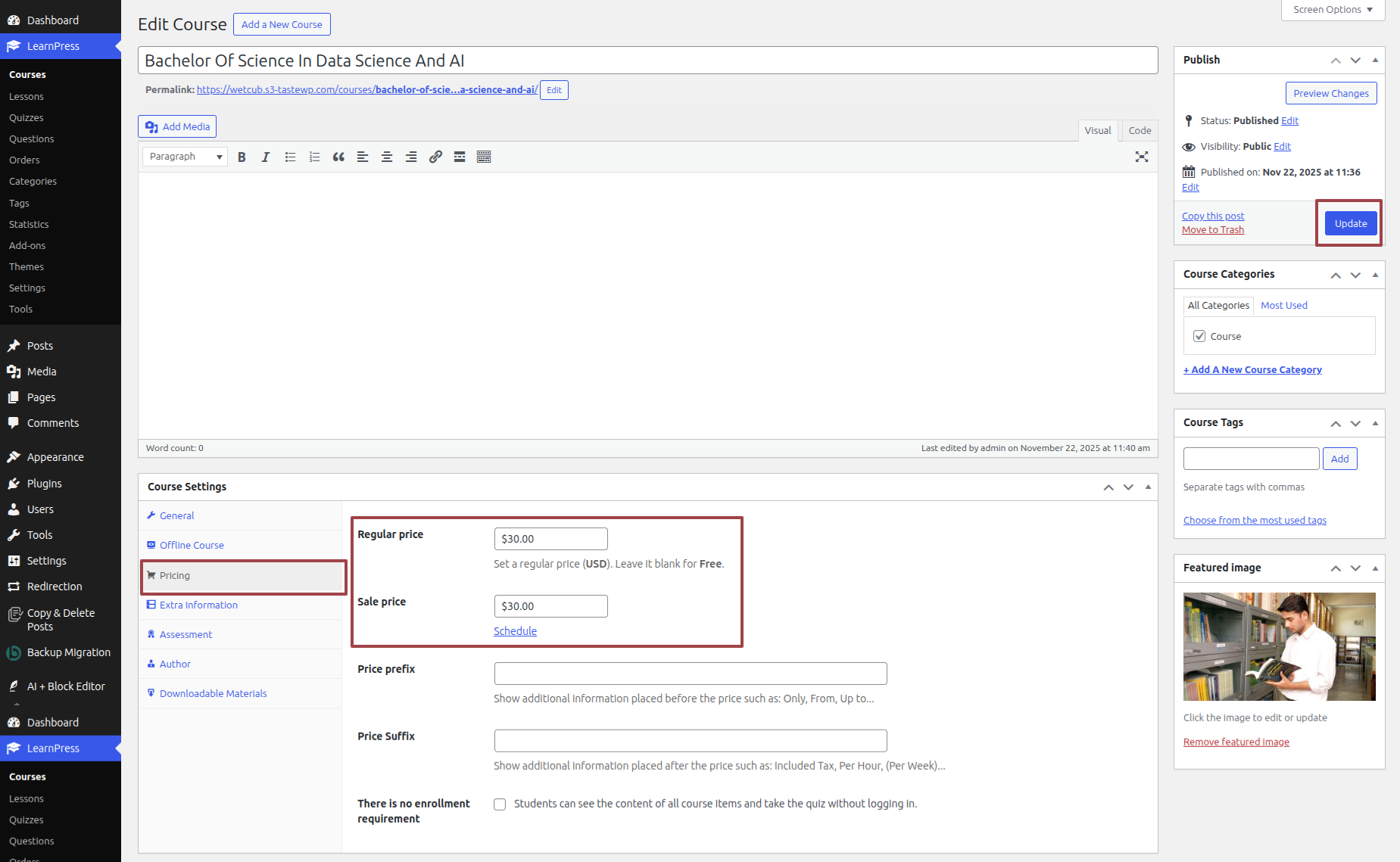 Click Dashboard >> LearnPress >> Courses >> Add a New Courses >> Pricing