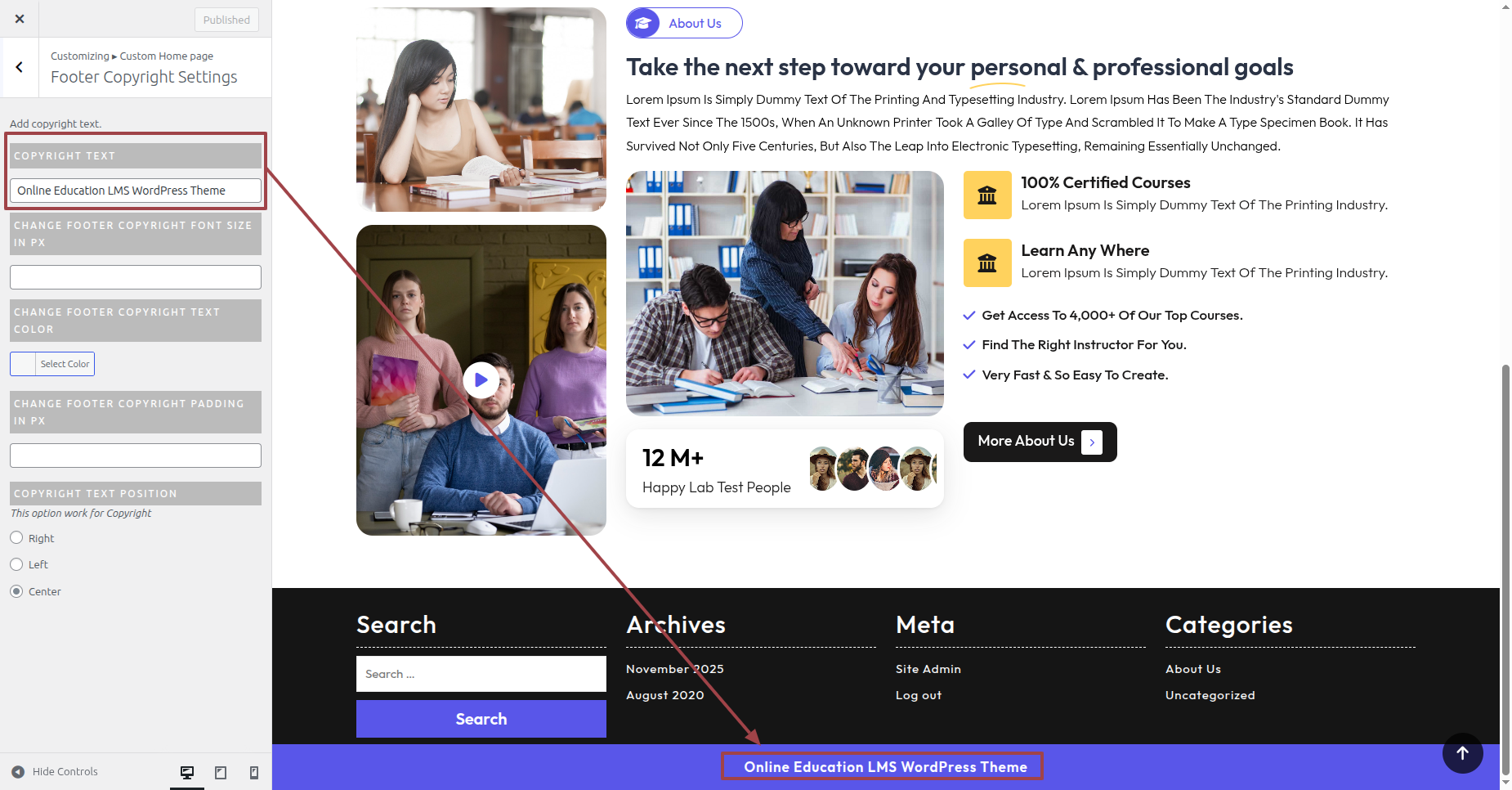 From Menu Click Appearance than Customize >> Custom Home Page >> Footer Copyright Settings