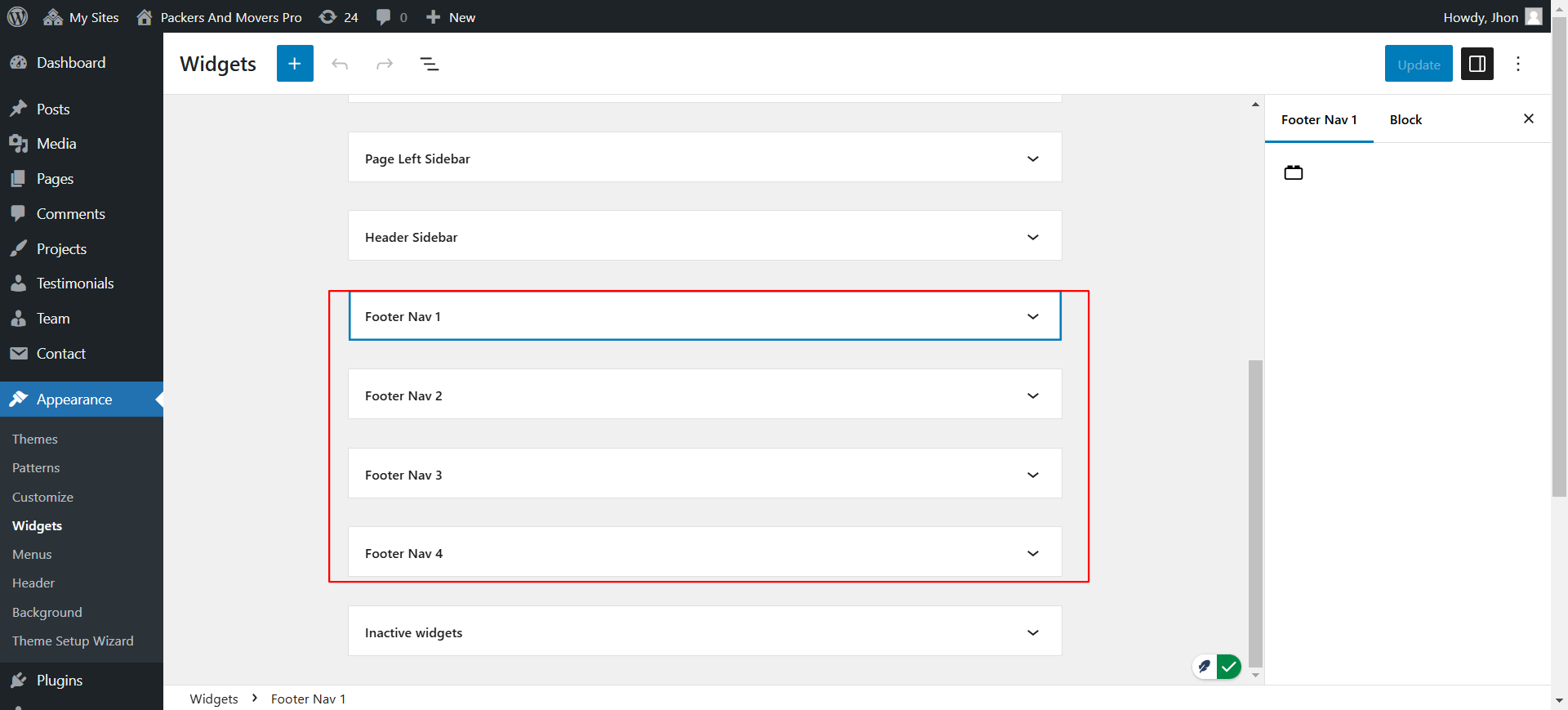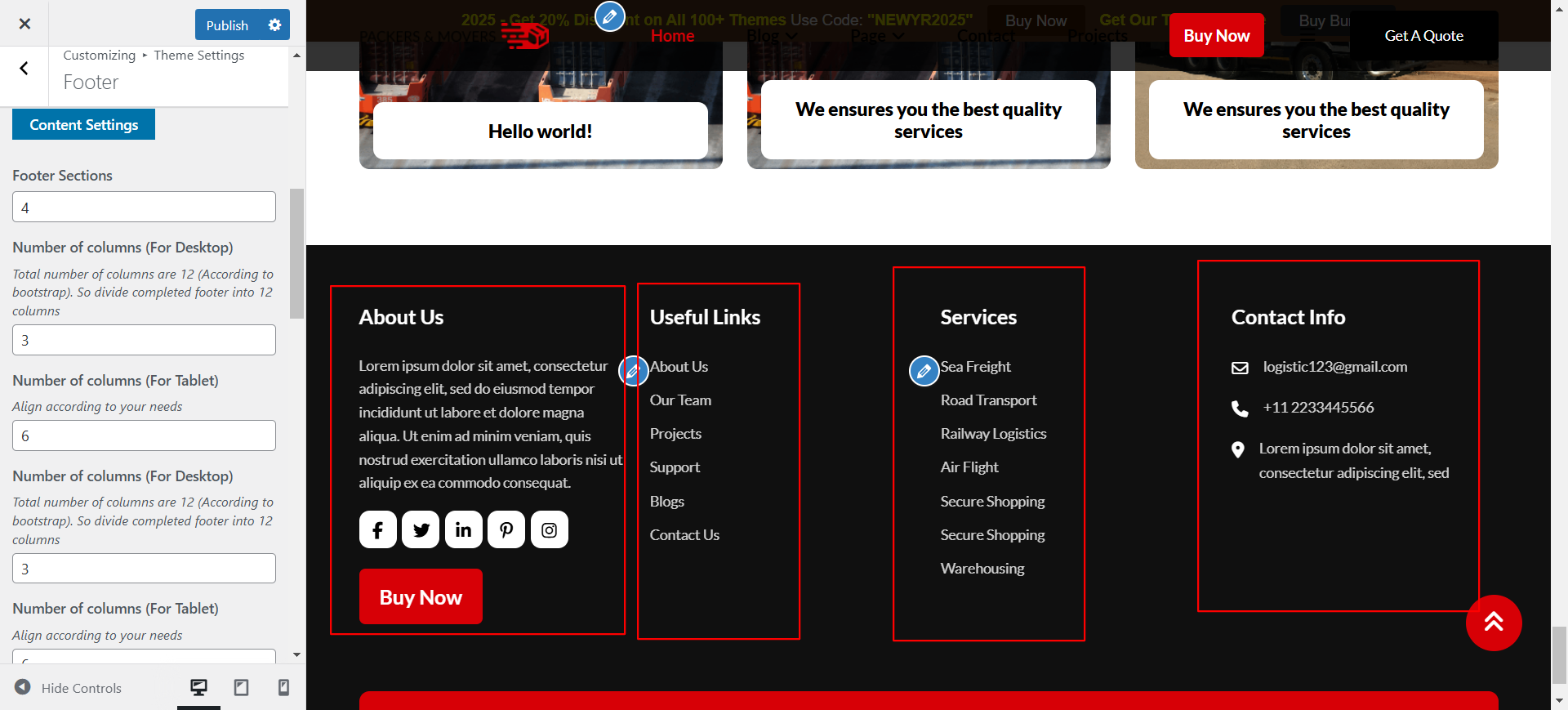 Inorder to change the footer widget content. Open Appearance -> Widgets. There are four footer columns created. Open it one by one and update its data. For the navigation menues first you need to create the menu from Appearance -> Menus then from here "Navigation Menu block will show your respective menu."
