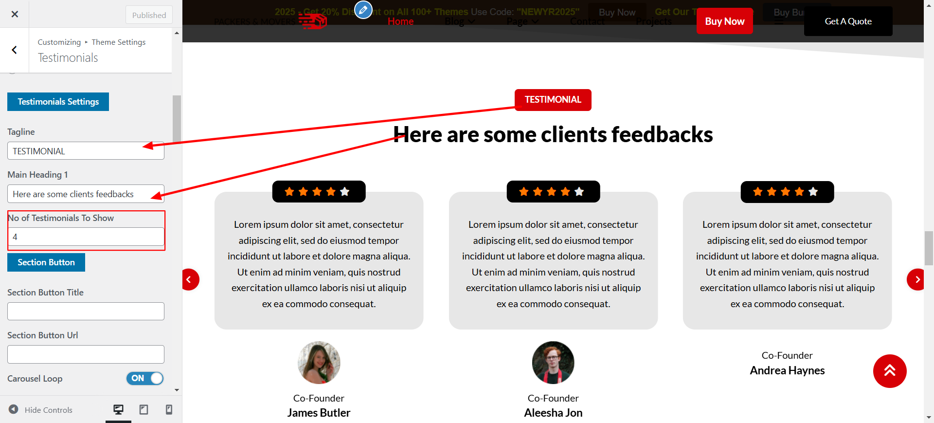 Open Testimonials present under theme settings pannel