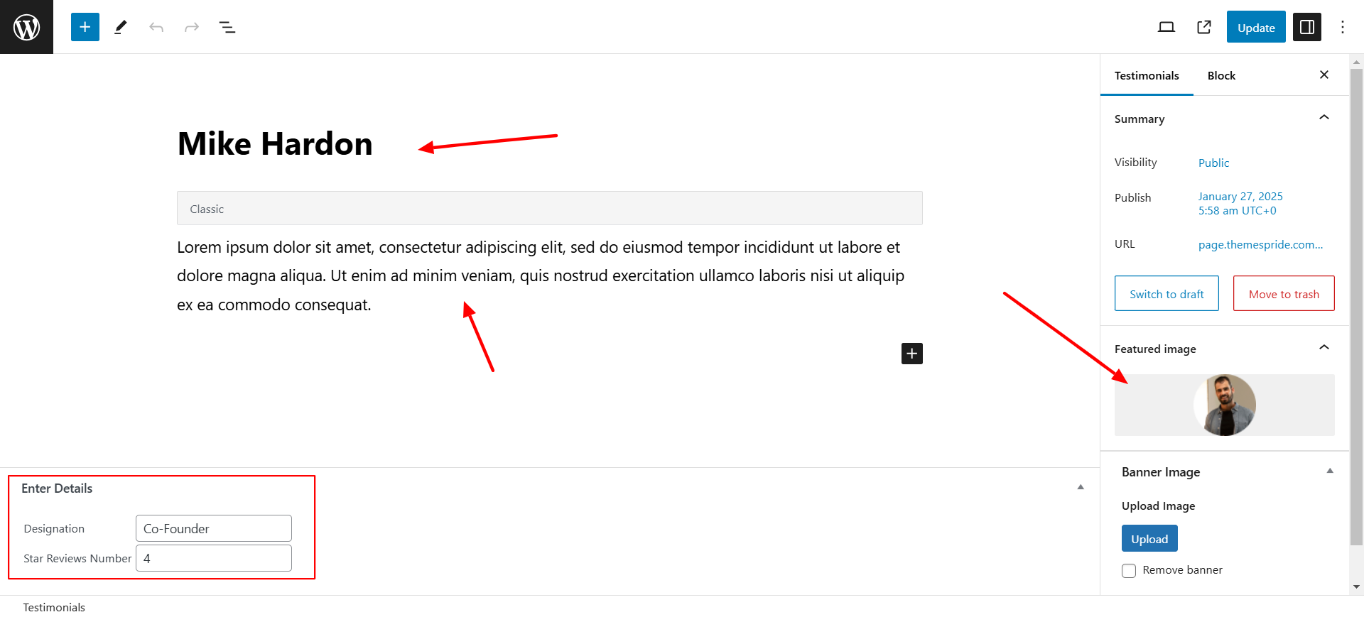 Now open Dashboard - Testimonials. Demo testimonials added you can change it according to your requirement.